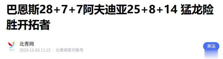 北青网(巴恩斯28+7+7阿夫迪亚25+8+14 猛龙险胜开拓者 2025.12.03)