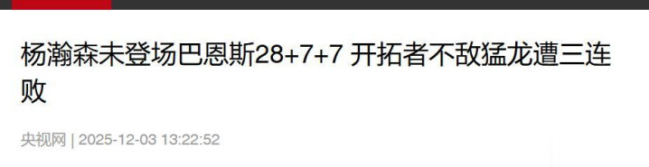 参考链接央视网(杨瀚森未登场巴恩斯28+7+7 开拓者不敌猛龙遭三连败 2025.12.03)
